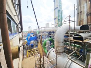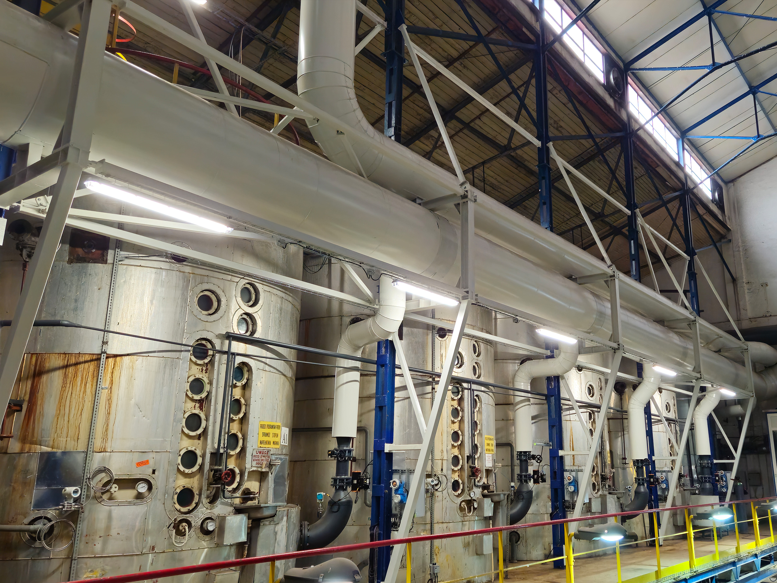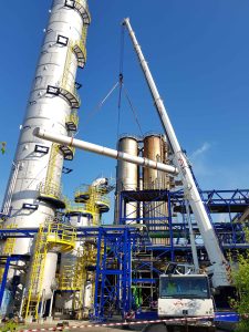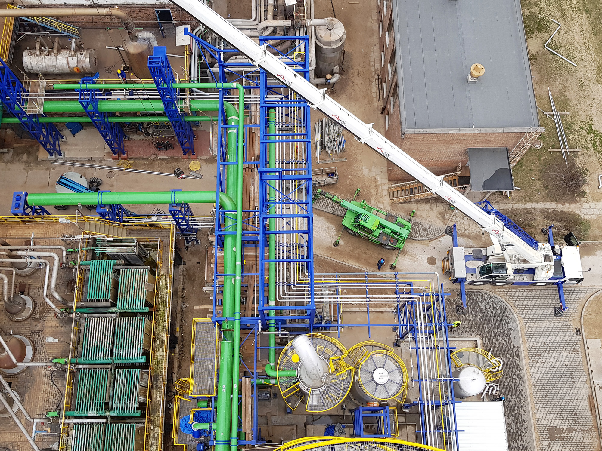 • Montaż aparatu wyparnego F=6000m2 z oprzyrządowaniem. Całkowita waga zamontowanych elementów wyniosła ponad 150 ton. Zakres obejmował:
